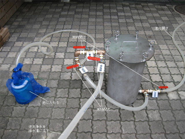 逆洗浄の時は、「常時閉め」バルブを「開け」にして、「常時開け」バルブを「閉め」にして5〜10分行ってください。